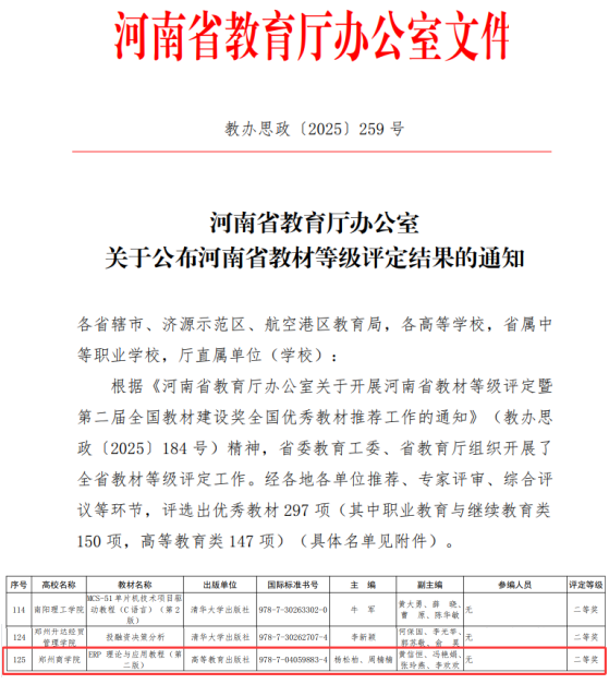10月10日,由德赢官网ERP沙盘模拟实验课程组编撰、高等教育出版社出版的《ERP理论与应用教程(第二版)》教材在河南省教材等级评定中荣获高等教育类二等奖,并代表河南省参加第二届全国教材建设奖全国优秀教材评选。