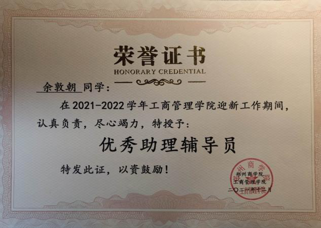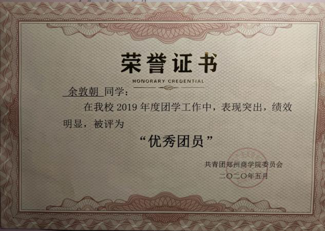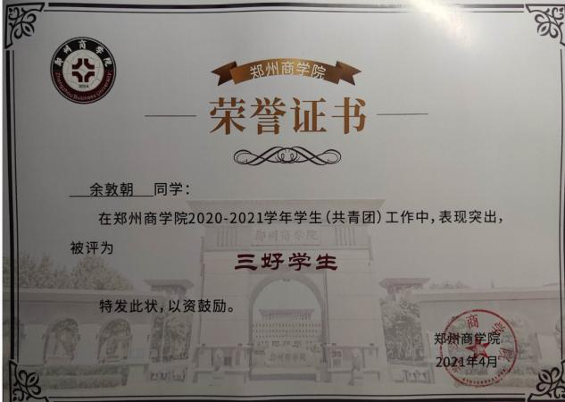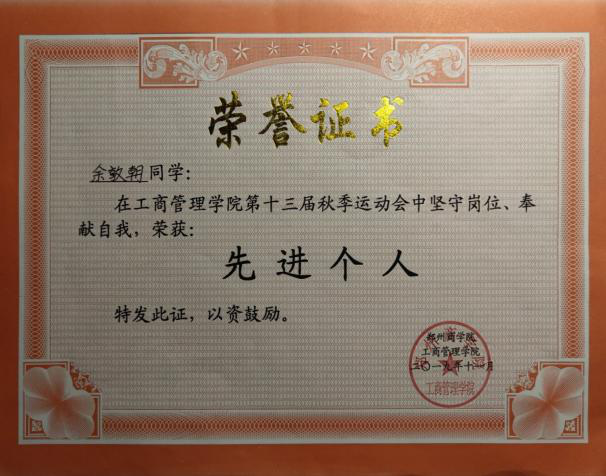 余敦朝同学十分热爱劳动,在入学期间就积极加入学生会生活部,投身于整个学院的劳动教育中,检查,维持,打扫校园卫生,在日常的劳动教育中,积极参加,认真负责,曾在2019年工商管理学院秋期运动会并担任会场服务人员,在运动会中,恪尽职守,坚守岗位,并荣获“先进个人”荣誉证书。