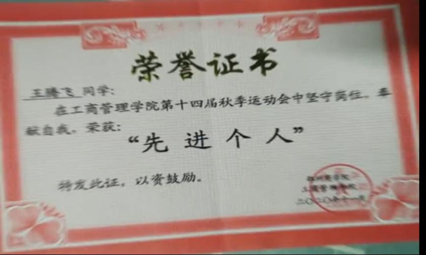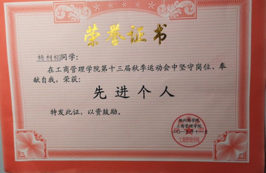 2019年—2021年期间杨柯栩同学在工商管理学院体育部工作,他从不安排别人帮他完成任何一件事,每当学院有下达的活动通知,他都率先开始统筹准备,以自己的实际行动带领大家完成工作。曾在2020年组织策划工商管理学院秋期运动会并担任会场服务人员,在这期间坚守岗位,为在场的工作人员起到了良好的带头作用,并于2020年荣获“先进个人”荣誉证书。