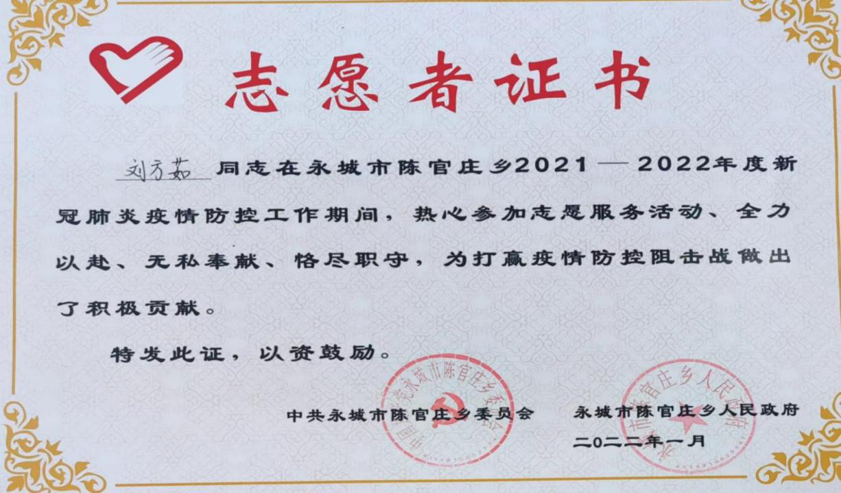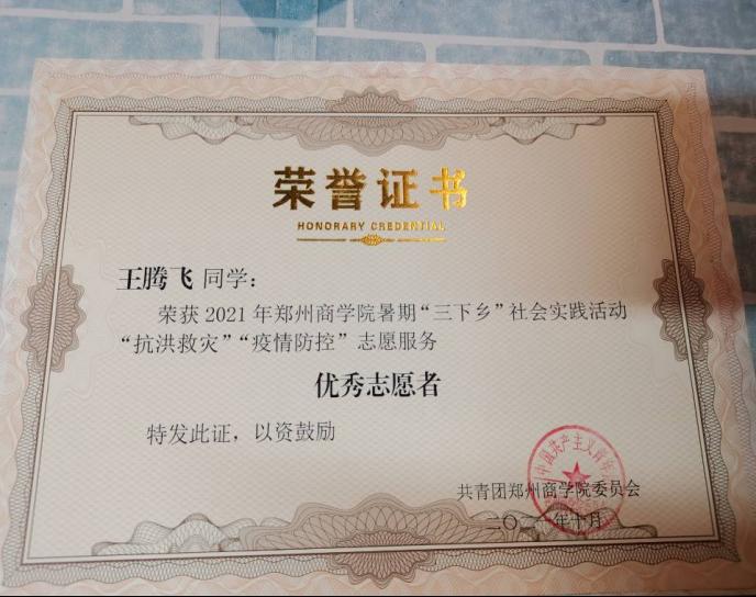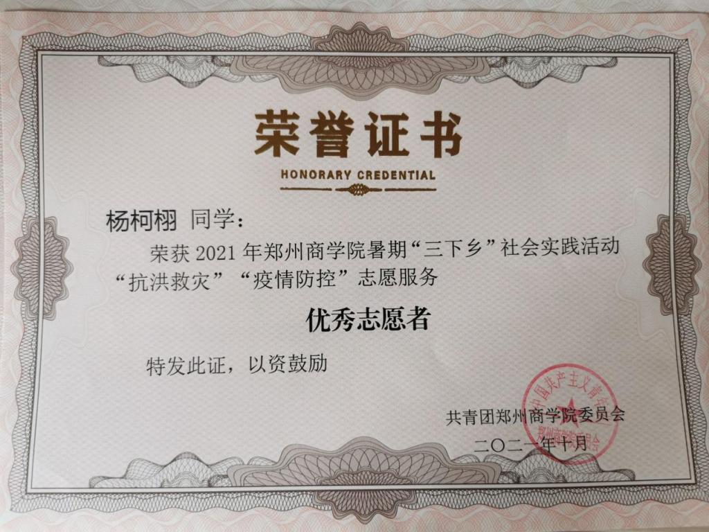 2021年7月24日起杨柯栩同学代表学校参加了由巩义团市委组织的青年志愿者服务,他跟随郑州共青团团队前往巩义市灾区小关镇,主要工作是帮忙搬卸来自各地爱心人士及爱心集团送来的物资共计15吨,并于2021年10月荣获学校颁发的“优秀志愿者”荣誉证书。