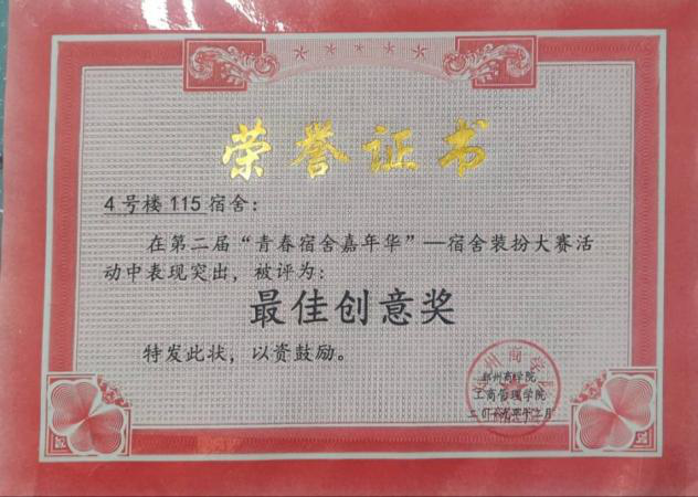 同时余敦朝同学不仅在班级里发扬劳动精神,还在宿舍里发扬劳动精神,在大一担任宿舍长期间,积极参加最美宿舍评比活动,在宿舍装扮大赛中荣获“最佳创意奖”。