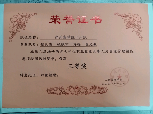 专业知识的学习不仅仅在课本上,更在实践中。符强同学积极主动参加学校各类活动和比赛,他参加了学校举办的第一届心理微视频制作,并获得优秀奖。参加第八届海峡两岸大学生职业技能大赛人力资源管理技能赛校园选拔赛,并获得校赛三等奖。借助竞赛平台,对专业知识有了更深层次的认识,开阔了视野,在实践和比赛中不断提高自身的综合能力。