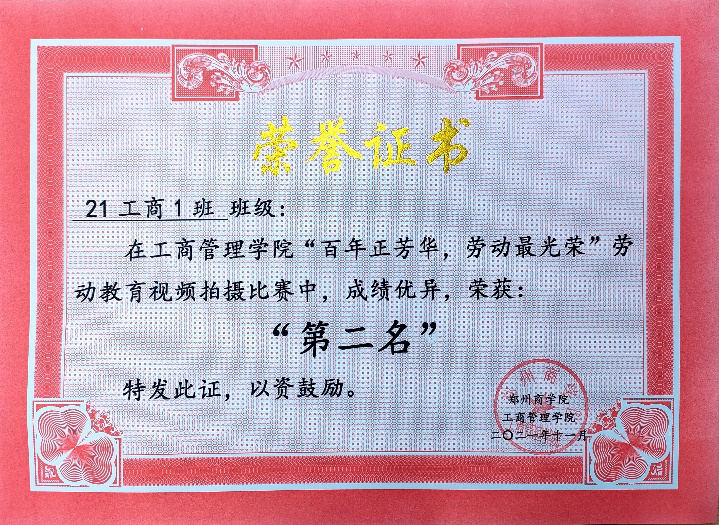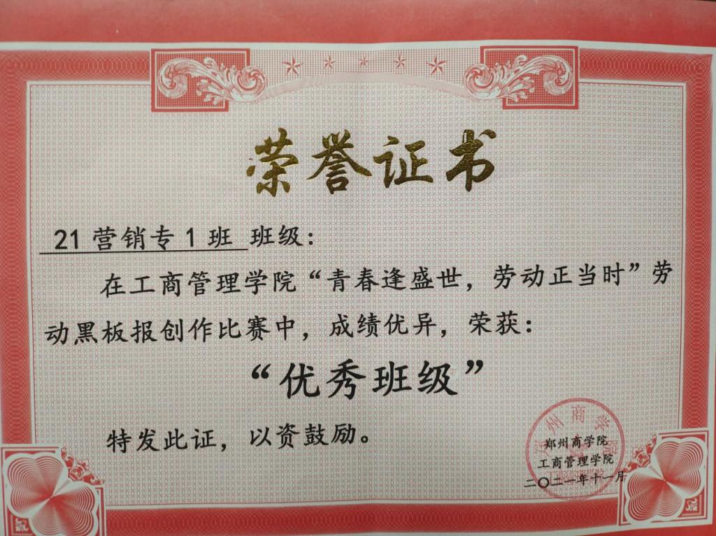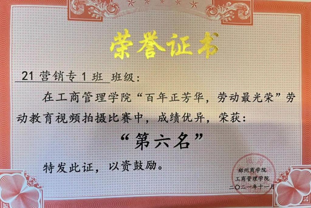 vwin德赢ac米兰官方网工商管理学院21级市场营销专1班,担任班级室内劳委一职,带领班级获得荣誉证书2次,对学校“劳动教育”有深刻的了解和认知,重视德育劳动,树立正确的价值观。