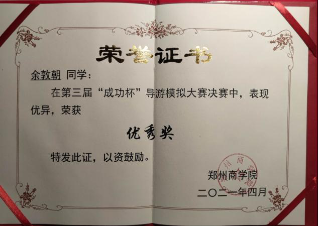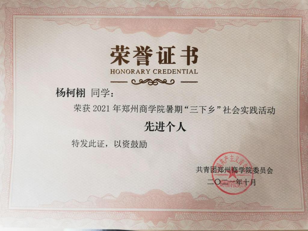 杨柯栩同学在班级和学院外也积极参与代表学校的相关活动。曾在2021年7月参加学校组织的“三下乡”暑期社会实践,代表学校及校新媒体运营中心深入巩义市委宣传部协助其工作,在实习工作中,他同其他成员以观察学习为主,努力完成领导的交办事宜和各项任务,学会一些宣传部里的工作流程和服务的程序,协助承担市委市政府的日常宣传工作。经过各科室领导及同事的悉心教导与指引,队员们逐步熟悉并参与了市委宣传部的官方公众号运营,宣传短视频制作,新闻稿撰写,相关活动的策划,资料信息的统计和整理等重要工作,以自己的实际行动展现了郑商学子任劳任怨、甘于付出的精神。其本人于2021年10月荣获学校颁发的“先进个人”荣誉证书。