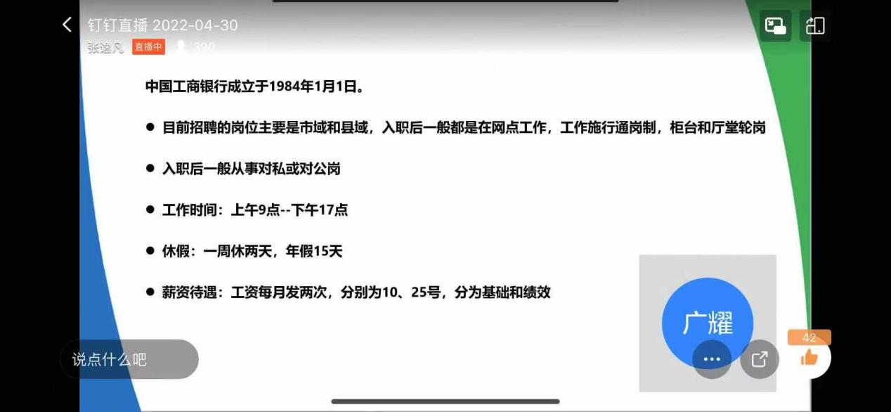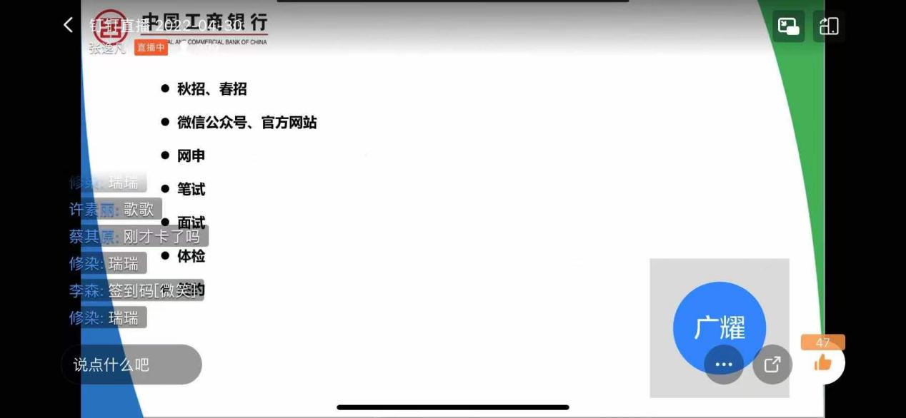 为深入贯彻落实学校就业创业安排部署,持续推进我院线上就业攻坚月系列活动,提升学生择业竞争力,坚定就业信心,帮助同学们更好的了解银行招考流程,更清晰的认识到在就业方向上的选择,4月30日晚,我院开展了“春风送暖”线上就业促进月第六讲——银行招录经验分享。本次分享交流会邀请17级财务管理专业校友路广耀(目前就职于中国工商银行平顶山分行)为同学们分享银行考试的经验。