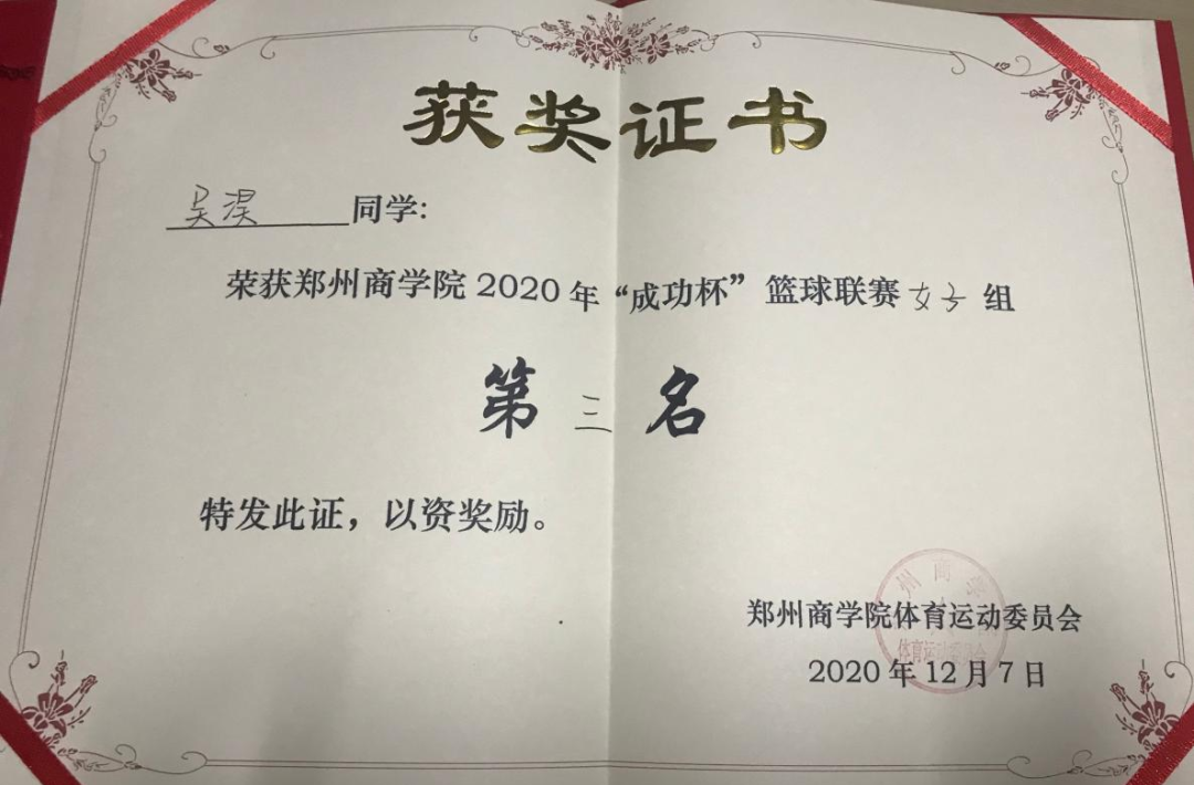 吴淏同学积极主动参加学校组织的各项体育联赛和校园运动会,体育竞赛的精神不仅仅在课本上,更在实践中。作为工商管理学院的学生,她积极参加vwin德赢ac米兰官方网2020年“成功杯”篮球联赛,加入工商管理学院女子篮球队,代表学院参加比赛,并在比赛中获得女子组团体第三名的好成绩。借助学校提供的竞赛平台,认识了各个学院的同学,增进了学院间友谊,开阔了视野。在公平、激烈、精彩的竞争中提高了身体素质,并且领悟了团队协作的精神和力量。