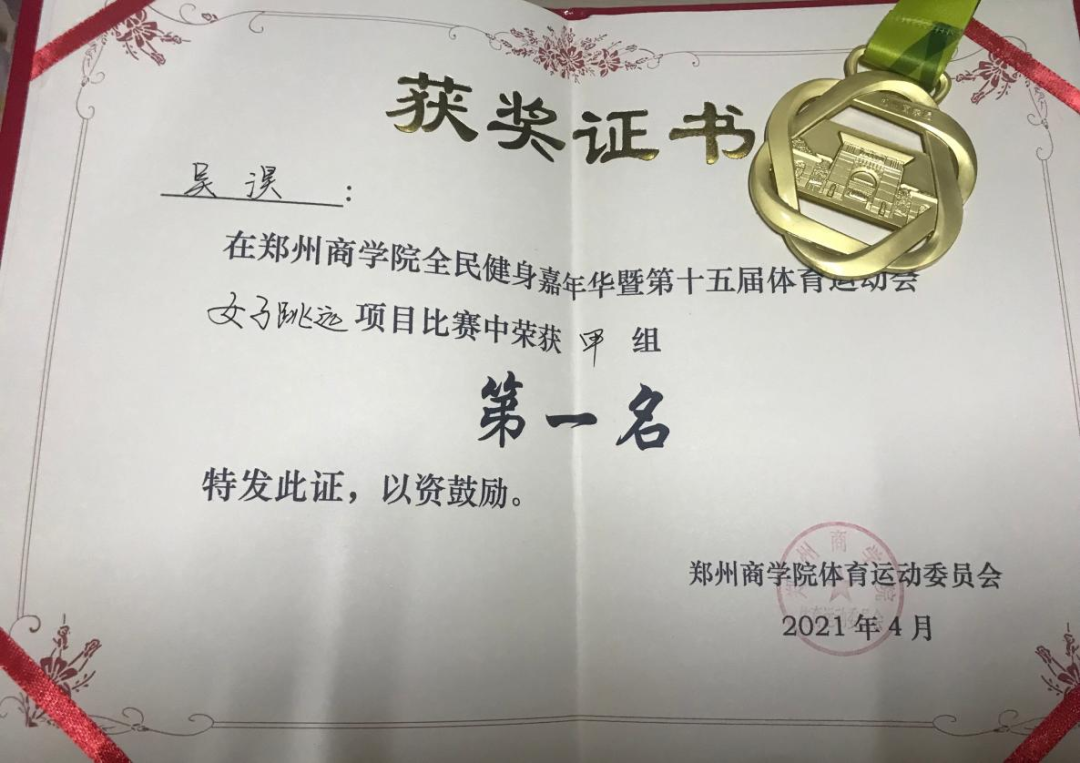 吴淏同学对体育运动有着浓厚的兴趣,在vwin德赢ac米兰官方网举行“科学运动 健康郑商”全民健身嘉年华暨第十五届体育运动会中,她发挥自己的体育专项能力,在赛场上奋力拼搏,在女子跳远项目比赛中荣获甲组第一名的好成绩。紧接着参加了女子4×100米接力赛,在紧张又激烈的竞争中,凭借团队配合能力,获得了甲组第二名的好成绩。在运动场上,她勇往直前,不畏不惧,以实力捍卫团队荣誉,赛出水平、赛出风格。完美体现了“科学运动 健康郑商”的运动精神。