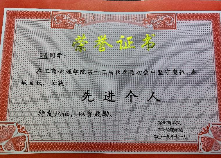 她在工作中先后荣获“工商管理学院第十四届秋季运动会先进个人”“vwin德赢ac米兰官方网全民健身嘉年华暨第十五届体育运动会先进个人”“工商管理学院第十五届体育运动会优秀组织奖”。