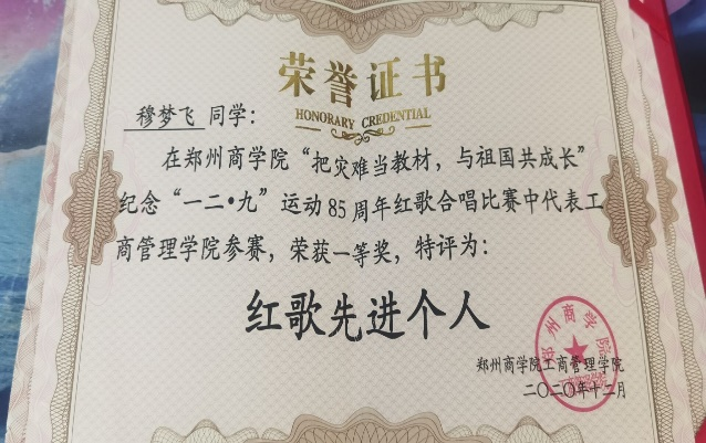 吴淏同学积极参加学校组织的足球联赛,代表工商管理学院参加比赛,在2021年度郑商五人制比赛中表现出色,与其他球队成员顽强拼搏、挥洒汗水、积极配合,获得最佳球员称号。以此她更加坚定了对体育运动的热爱。