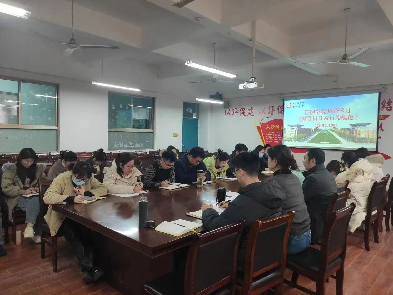 为切实加强辅导员队伍建设,提升辅导员的职业素养和工作能力,贯彻落实学校《辅导员日常行为规范》文件要求,2月29日下午,管理学院在2号楼二楼会议室组织召开《辅导员日常行为规范》专题学习会,管理学院党委书记宋森、团委书记魏瑶以及全体辅导员老师参加会议。