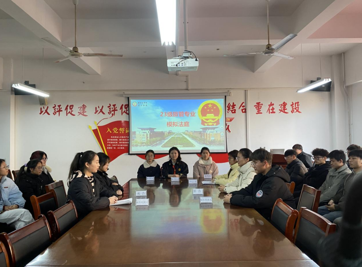 23旅管1班的两组学生以《旅行社侵权案》、《电梯吸烟案》为案例故事,进行模拟庭审过程。学生们严格按照真实的庭审程序进行模拟审判,法官公正无私地主持审判,检察官指控有力,律师辩护精彩,被告人积极配合,整个庭审过程井然有序。庭审结束后,王彦青主任对活动进行了精彩点评,对学生们的表现给予了高度评价,并通过酒店案例分享,以案释法,引导学生们树立正确的人生价值观与行为准则,继续发扬法治精神,成为懂法、守法、用法的好公民。