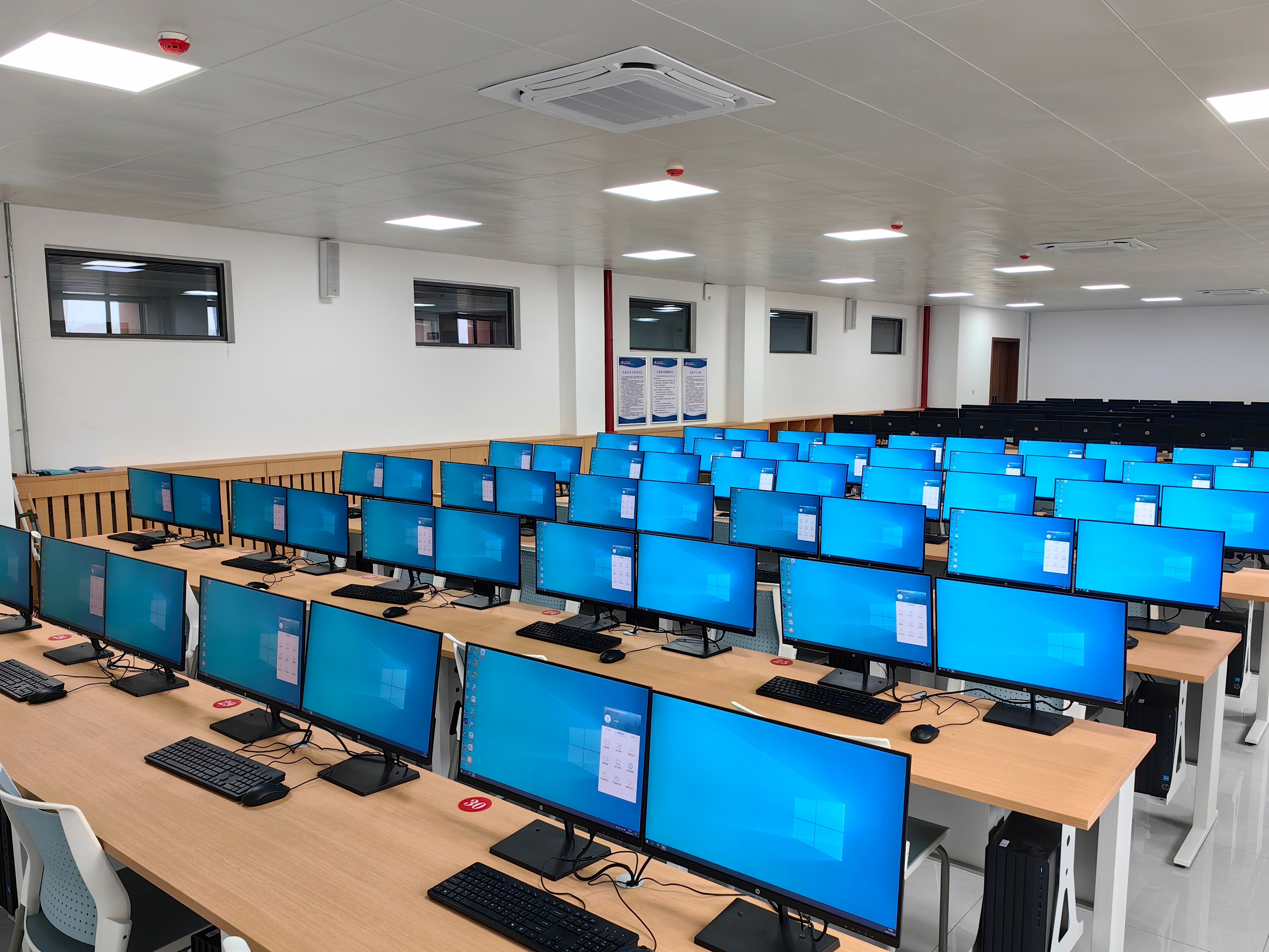 MC206数智设计实验室(二)是一个专业图形计算与多媒体实验室,该实验室配备了65台图形工作站,为三维建模、渲染与分析提供了强劲动力。软件方面,全面覆盖了Office、编程工具、以及Auto CAD、Revit、广联达、Navisworks、PKPM、YJK、桥梁博士等全链条工程软件。该实验室适用于高级图形设计、建筑信息模型(BIM)深度应用、复杂结构仿真、科研计算及多媒体互动课程,是进行前沿科学研究和项目实践的理想平台