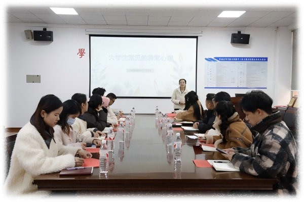 会议伊始,别老师简要介绍了此次座谈会的目的,接着由张老师为大家进行了以《大学生常见异常心理》为主题的讲座,从健康人格的特征讲到学生心理健康评估的方法,同时又对异常学生判断的原则和解决方法进行了深入的讲解。