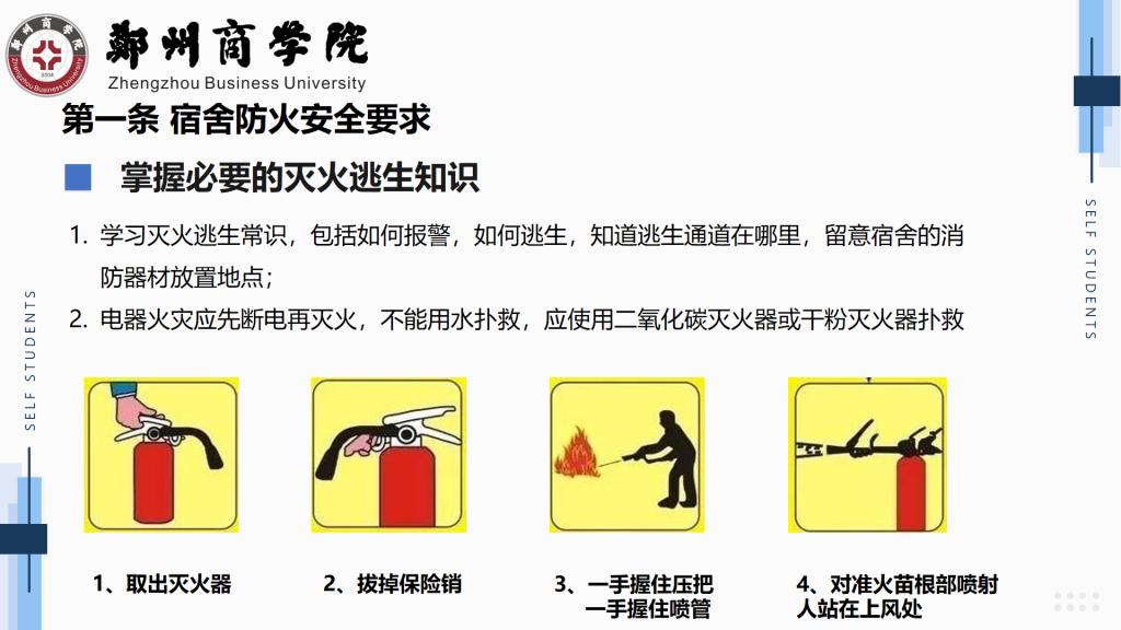 随后,22级新生辅导员以真实案例生动的向同学们阐释宿舍安全的重要性,宿舍安全隐患处处存在,人人树立安全意识,采取安全措施,严加防范。同时,辅导员们强调宿舍安全需要全体师生的共同努力,不断提高学生综合素质和自我普及宿舍安全知识,不断增强学生安全意识和自我管理,自我教育,自我服务的能力,从而营造一个安全,和谐,整洁,舒适的学习休息环境。