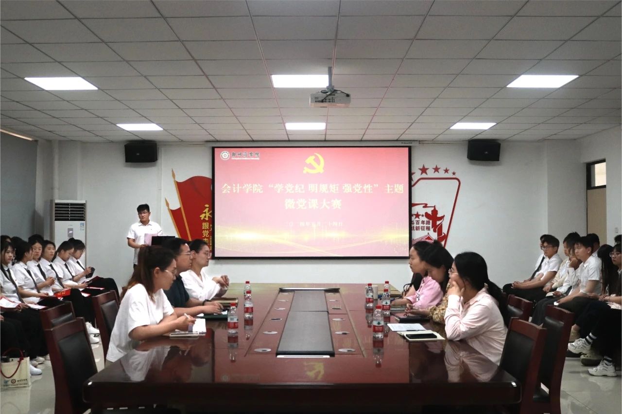 为深入贯彻习近平总书记关于党纪学习教育的重要讲话和重要指示精神,进一步推动党纪教育内化于心、外化于行,5月24日下午,我院于广恩楼103举办“学党纪 明规矩 强党性”主题微党课大赛初赛。会计学院党委书记刘宏涛、团委书记杨茗涵、组织委员洪娟及辅导员和学生党员代表参与此次活动,本次比赛由张煜坤同学主持。