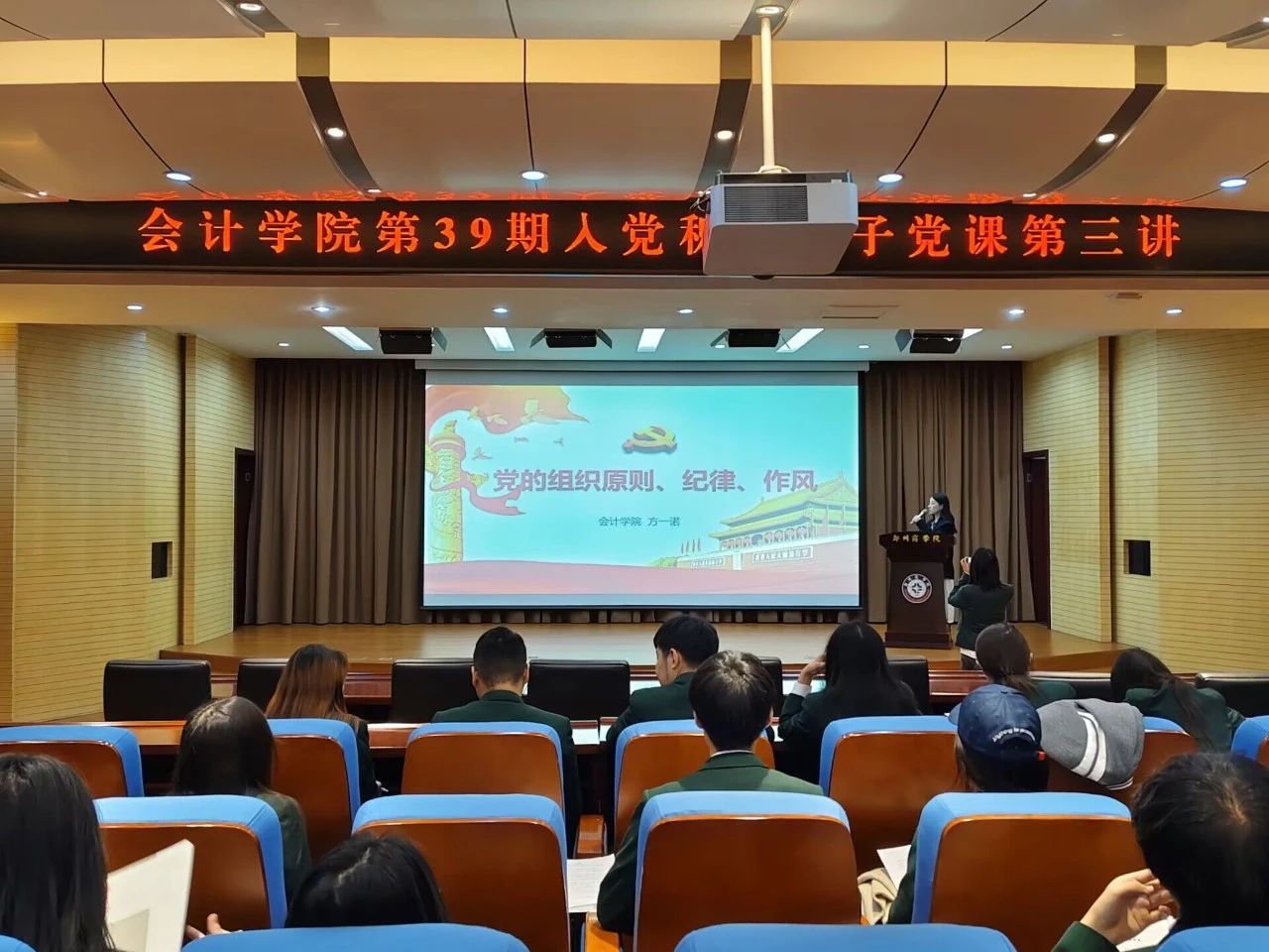 为进一步加强入党积极分子对党的组织原则、纪律、作风的了解,不断提高个人政治素质和思想觉悟,10月22日,会计学院在图书馆五楼报告厅开展第39期入党积极分子党课第三讲,此次党课由会计学院学生第四党支部书记方一诺同志授课。