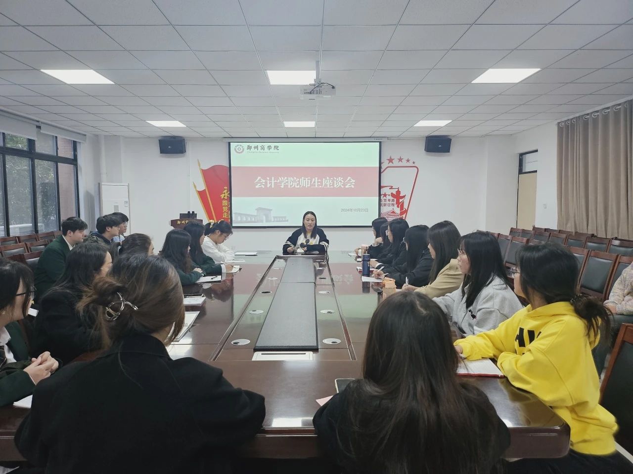 为了解学生生活情况,交流讨论并解决学生在日常生活中产生的问题,10月23日,会计学院于广恩楼103会议室举行师生座谈会,会计学院行政秘书兼团委书记孙柳阳及各班学生代表出席会议。