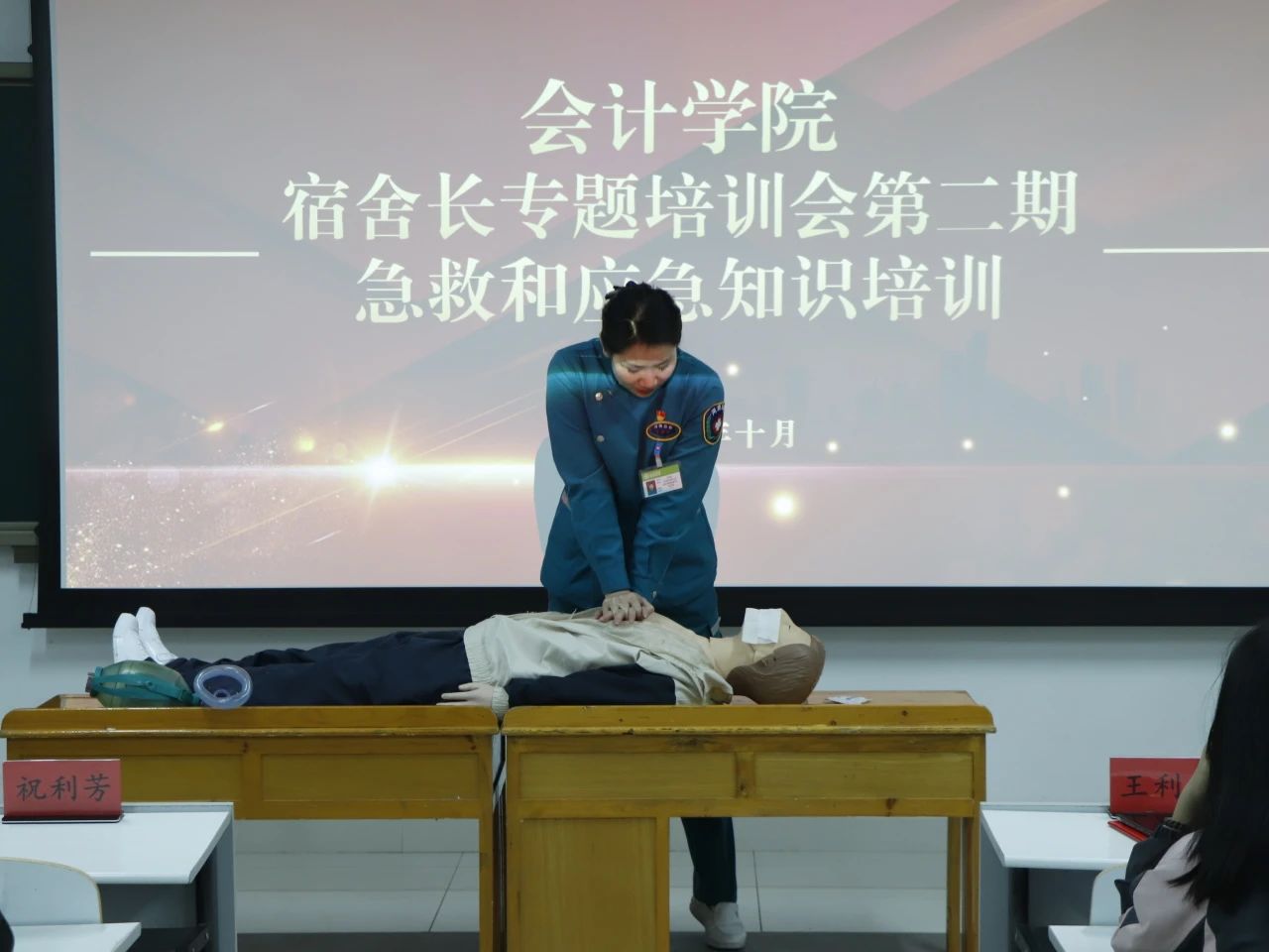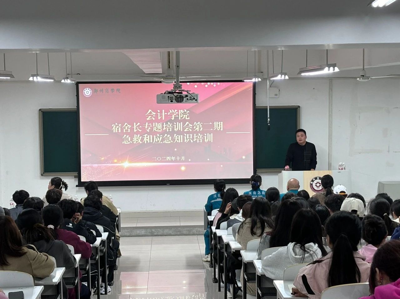 为全面普及学生的应急救护常识知识,进一步提升学生的自救互救能力,提高学生参与急救的积极性,维护宿舍安全稳定。10月31日晚,会计学院在广恩楼104教室组织2024级全体宿舍长和主要学生干部召开宿舍长专题培训会第二期——急救和应急知识培训。