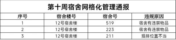 本周检查结果如下,希望以上同学尽快整改,其他同学也要吸取教训,共同营造安全文明的宿舍环境。