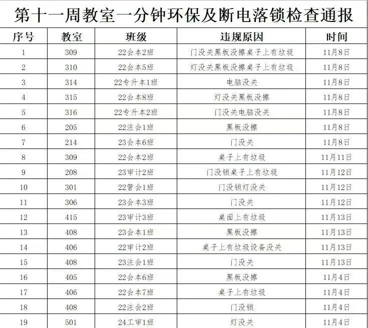 以下为本周“一分钟环保”巡查结果,希望各班同学能将环保意识牢牢铭记于心,切实做好“一分钟环保”相关事宜,为营造良好的学习环境贡献出自己的一份力量。
