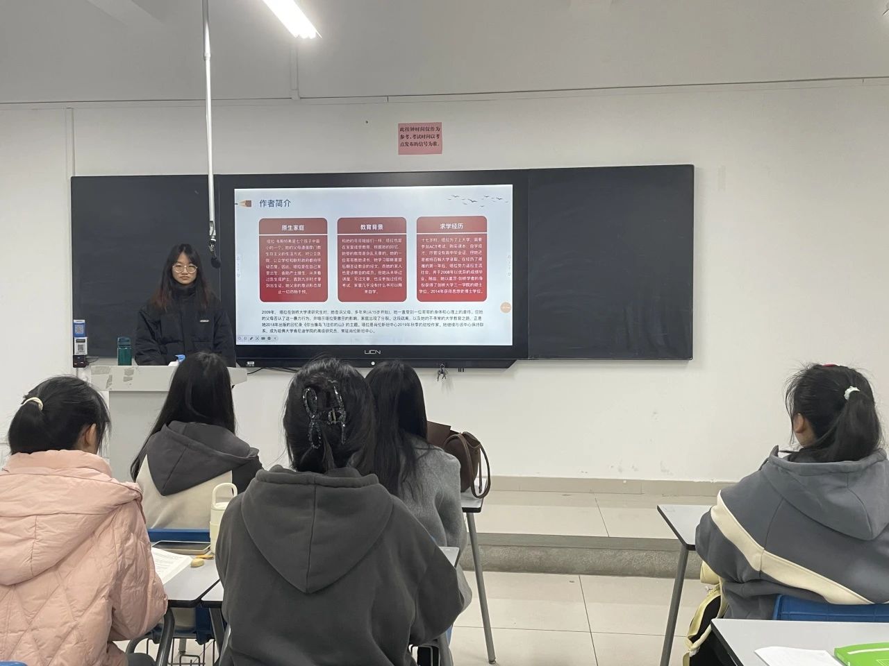 活动开始,分享者从作者的生平开始介绍这本书。作者丰富的生平简介吸引了同学们,激发起学生对这本书的兴趣。随着分享者讲述书中的故事,以及自己对这本书的鉴赏,使得同学们好似身临其境。