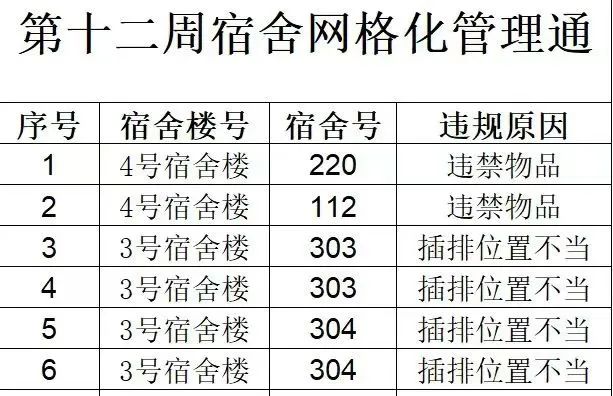 本周检查结果如下,希望存在问题的宿舍、同学引起重视并及时改正。其他同学也要吸取教训引以为戒,共同为营造安全文明的宿舍环境而努力。