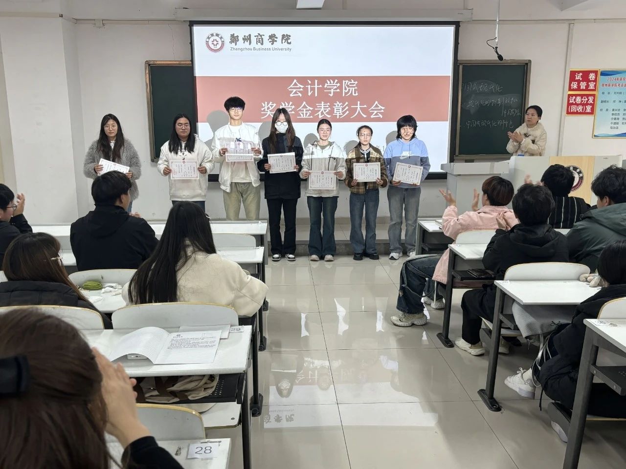 会上,各班辅导员宣读了获得奖学金学生名单,并为获得奖学金的同学颁发荣誉证书、合影留念。