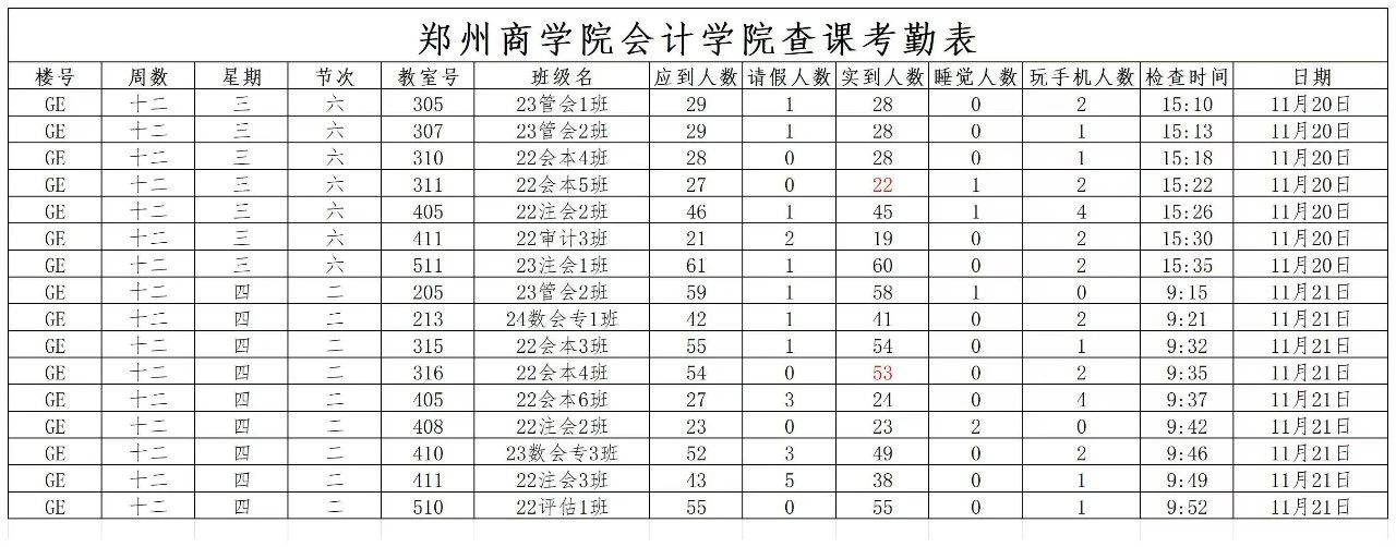 为进一步加强我院学风建设,提高学生的学习意识,帮助学生养成良好的学习习惯,从而营造良好的学习氛围。我院于第十二周继续安排学生干部进行系统的纪律检查,重点检查学生是否有在课堂上玩手机、睡觉、迟到早退以及携带早餐进入广恩楼等不良行为。