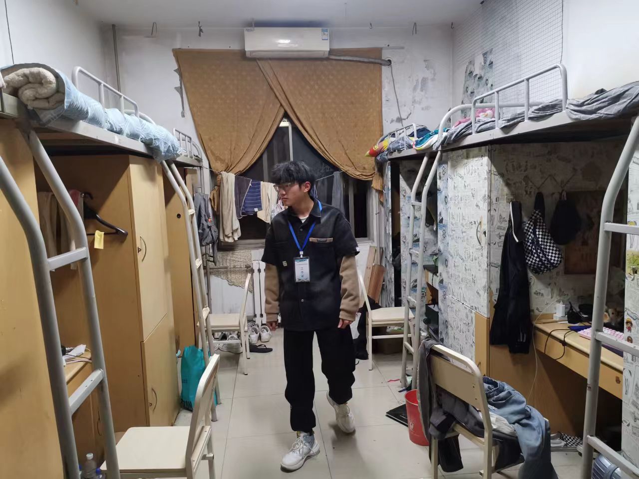 检查老师和学生干部秉持认真负责的工作态度,排查宿舍中的卫生情况、违规电器设备和一系列不文明现象,对电器使用与物品摆放等情况提出改进意见和劝告,师生齐心协力创造一个干净舒适的生活环境。