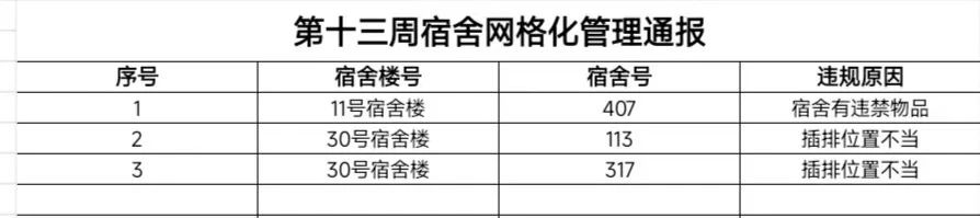 本周检查结果如下,希望存在问题的宿舍、同学引起重视并及时改正。其他同学也要吸取教训引以为戒,共同为营造安全文明的宿舍环境而努力。