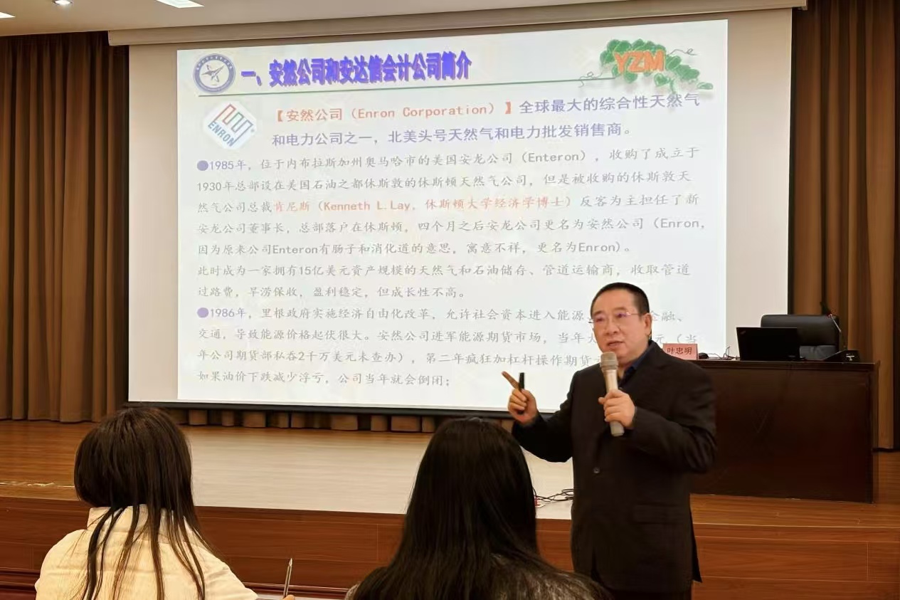 报告会上,叶忠明教授围绕“安然公司财务舞弊案例”展开,从安然公司和安达信会计公司简介、安然公司股票价格一路飙升之谜、安然公司实施财务舞弊的手法、安达信在安然舞弊案中的表现、安然公司财务舞弊带来的后果及案例中涉及的知识点6个方面进行具体阐述,由浅入深、逻辑严谨地还原安然公司财务舞弊案的真实面貌,并将案例中涉及的会计、审计、经济、金融、管理、法律知识点融入其中,使知识与案例深度耦合,既有严谨的专业知识,又有生动的案例事件,其独到的见解和新颖的分析视角赢得了在场师生的阵阵掌声。