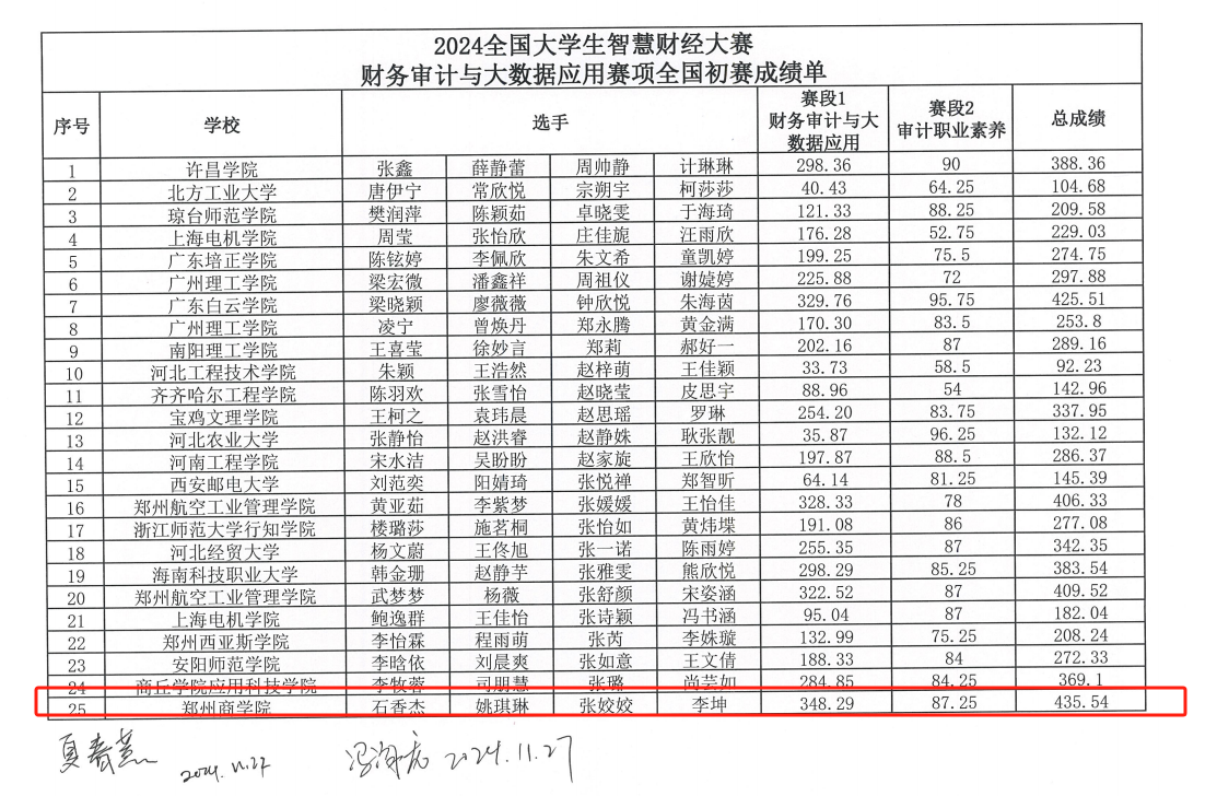 2024年11月27日,由中国商业会计学会主办,中国商业会计学会产教融合分会和郑州航空工业管理学院承办的2024年全国大学生智慧财经大赛—财务审计与大数据应用赛项全国初赛顺利举行,我院选拔出石香杰、姚琪琳、张姣姣、李坤四位同学组队参赛,在初赛中,四名同学以总分435.54的优异成绩摘得第一名,成功晋级决赛。