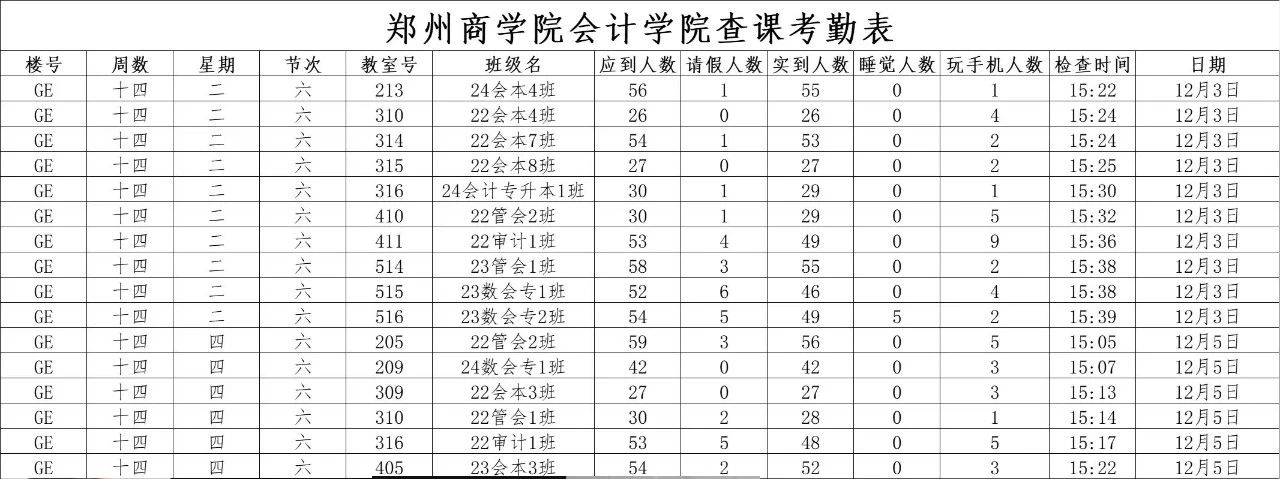 为进一步推动学风建设常态化与制度化,强化学生规范管理,助力学生养成良好的学习习惯,从而营造积极向上的育人环境,我院于第十四周继续推进学风建设工作,主要针对课堂纪律及学生行为规范,包括检查上课玩手机、睡觉、迟到早退、带早餐进课堂等现象,以及教学楼外电车停放不规范等问题。