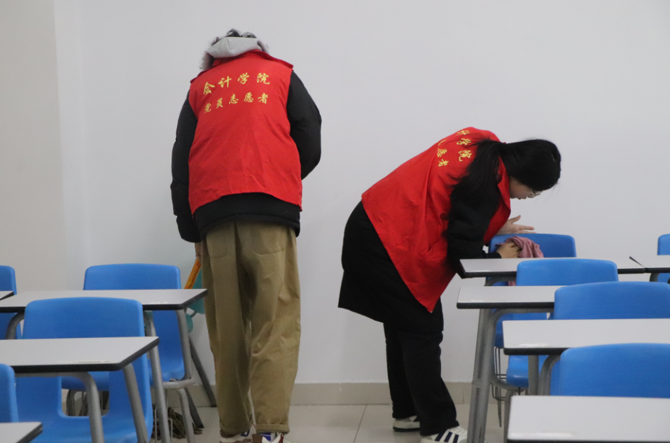 2024 年英语四六级考试将近,为给考生打造一个干净、整齐的考场环境,保障考试顺利进行,12 月 13 日下午,会计学院组织党员及入党积极分子在广恩大楼开展了四六级考场清扫活动。