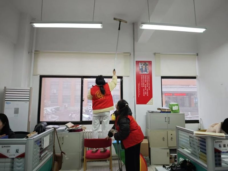 活动伊始,学生志愿者们在学院老师的有序组织下,迅速分组,明确各自的任务分工,对办公室桌面、文件柜、地面及窗台等区域展开清洁。教职工带头整理办公资料、擦拭桌椅,学生志愿者则重点清理卫生死角,并对公共区域的绿植、宣传栏进行维护,大家仔细认真,用实际行动诠释了劳动的价值。