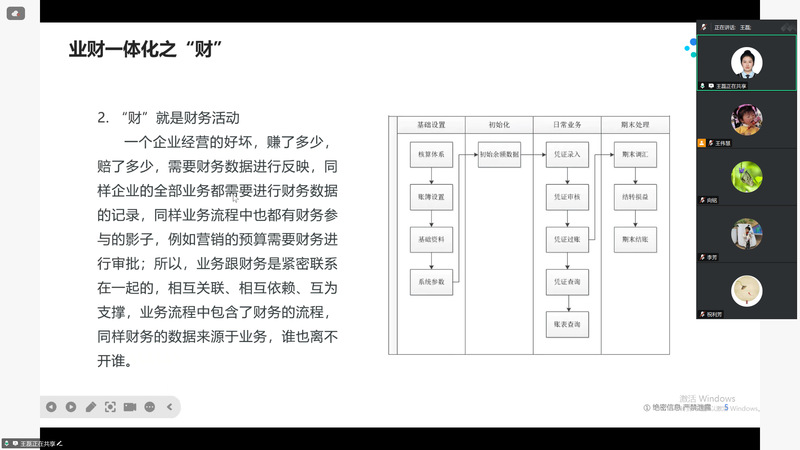 随后,金蝶王老师从《业财一体化》实验课程主要内容、课时安排以及E云教学管理平台三个方面进行了具体的阐述与演示。其中,金蝶王老师重点介绍了E云教学管理平台,包含系统管理、财务系统初始化、供应链系统初始化、常见日常业务处理、期末处理、报表管理和合并报表。该平台内置多层级权限管理系统,支持教师一键部署跨岗位实训任务;通过“业务单据-财务凭证-管理报表”的数据穿透功能,直观呈现业务背后的财务逻辑;特有的合并报表模块更可模拟集团财务管控场景,培养学员全局视野,提升学生灵活业务处理的能力。最后,参会教师积极围绕课程设置、课时学分分配、平台可容纳人数以及各模块之间的衔接等问题展开了交流,王老师均一一详细解答。