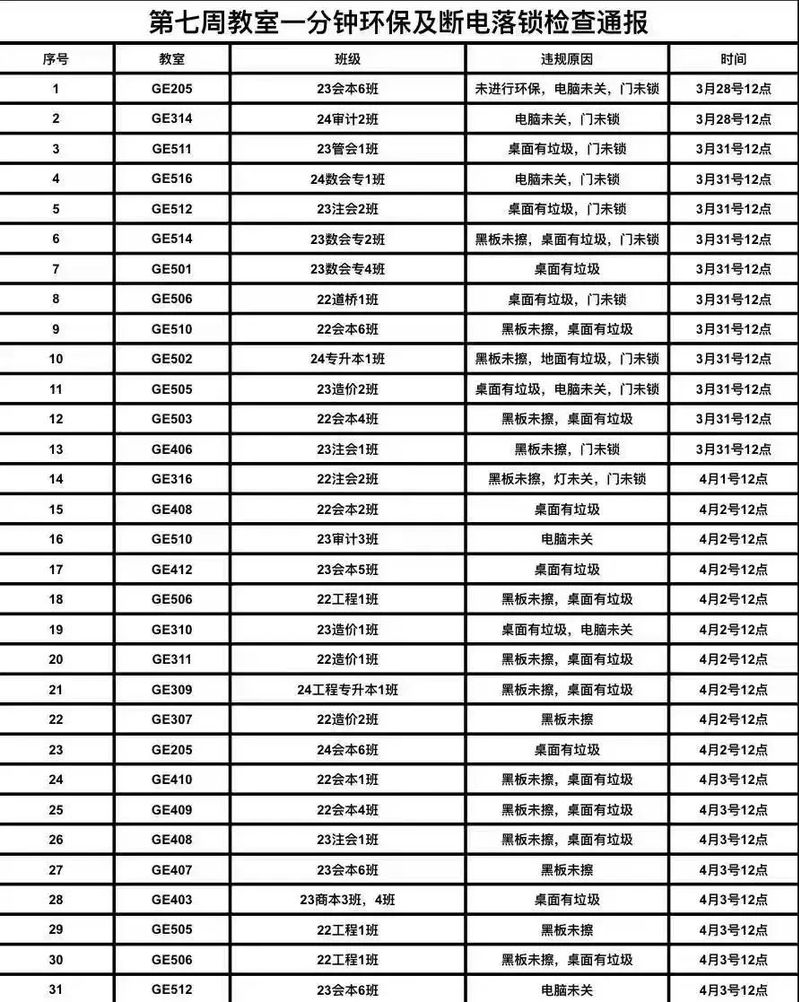 现将本周巡查结果予以公布。期待同学们持续践行良好的环保习惯,将“一分钟环保”理念深深扎根于日常行为之中。从自身出发,主动为营造整洁的学习环境贡献力量。
