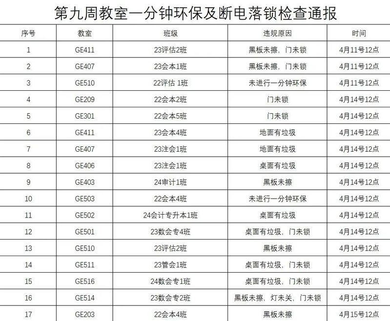 现将本周巡查结果予以公布。希望同学们把良好的环保习惯融入日常,长久坚持,让“一分钟环保”理念在举手投足间落地生根。从自己做起,积极投身打造整洁舒适的学习环境,为校园美好出一份力。
