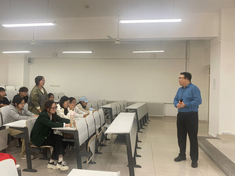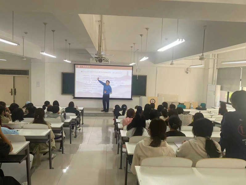 张老师首先介绍延安大学基本办学情况,重点说明学校在人才培养、科学研究领域的成果,使学生对延安大学形成全面认识。随后,张老师阐述经济与管理学院基本概况,介绍学院的学科建设、师资力量及科研平台。接着,张老师结合研究生培养方案,说明研究生相关专业的课程设置、学制安排与培养目标,让学生了解未来学习及发展路径。最后,张老师解读学院研究生招生政策,内容涉及招生专业与方向、复试安排、奖学金体系。在互动环节,张教授就学生提出的报考策略、学习规划相关问题进行回答。现场氛围热烈,学生参与度较高,表现出对考研的热情与信心。
