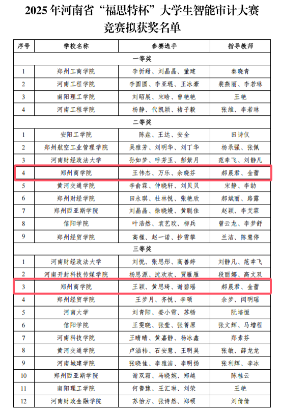 10月26日,2025年河南省“福思特杯”大学生智能审计大赛决赛在郑州航空工业管理学院圆满落幕。我院两支参赛队伍在激烈角逐中表现优异,分别荣获二等奖和三等奖,不仅展现了学生扎实的专业素养和实践能力,更充分体现了学院在智能审计人才培养方面取得的阶段性成果,是推动“以赛促教、以赛促学、赛教融合”教学改革的生动实践。