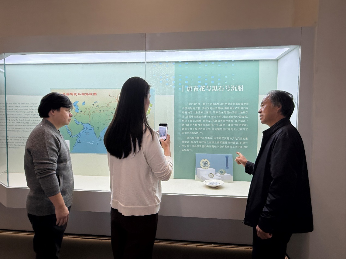 在游光明董事长的引导下,教师团队系统参观黄冶窑遗址保护展厅与唐三彩主题陈列馆。游总围绕巩县窑历史脉络、唐三彩考古发现及文化价值展开详细讲解,重点解析馆藏陶瓷、三彩陶、唐青花瓷的釉色工艺与创新突破,让教师们直观感受河洛陶瓷艺术的深厚底蕴——这些鲜活的文化遗产与技艺细节,为《河洛文化赏析》《美术鉴赏》等美育课程提供了“从文物到课堂”的生动教学素材,为课程内容迭代与实践教学拓展奠定基础。